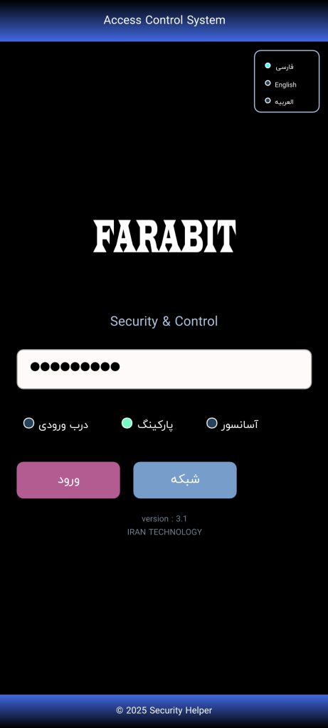 - نرم افزار کامپیوتر: نرم افزار pc برای لابی من و اتاق نظارت شامل امکانات ۱- خروجی ttl قابل تبدیل به rs232 ، ارتباط rs485، ارتباط spi و سایر ۲- قابلیت گزارش گیری و ذخیره لاگ آنلاین ۳- آمار ورود و خروج ۴- کلید باز و بستن درب ۵- مشاهده آنلاین ورود و خروج با نام افراد